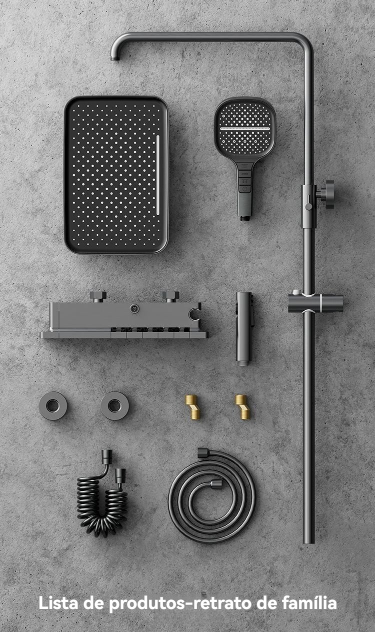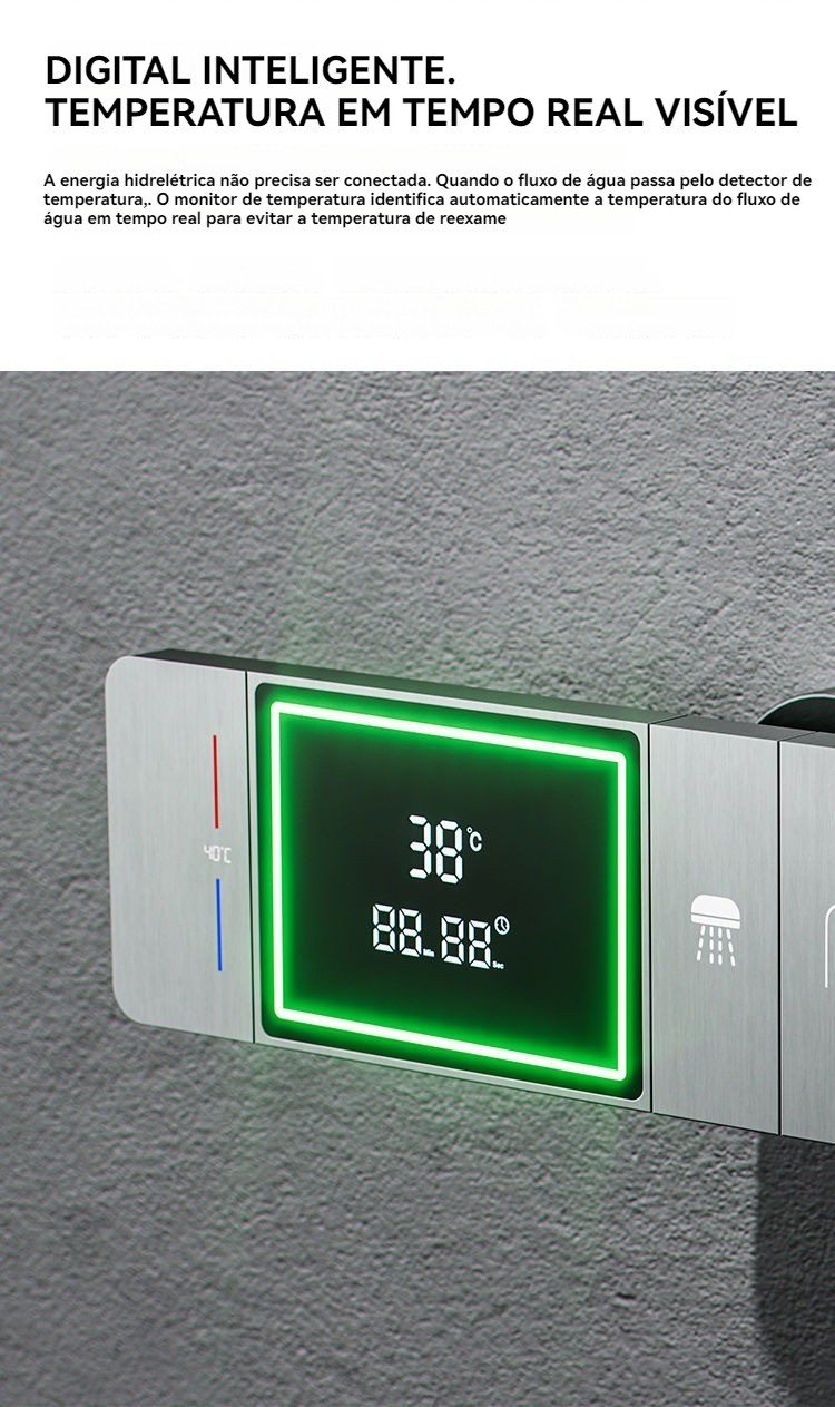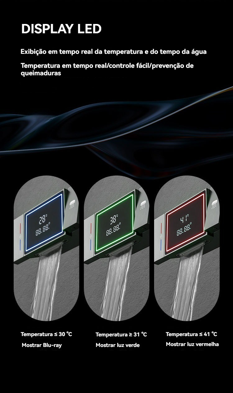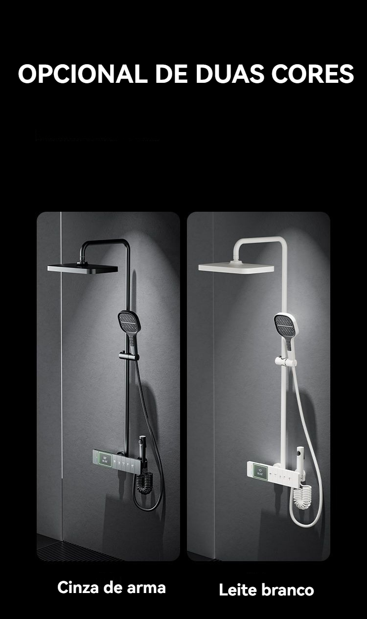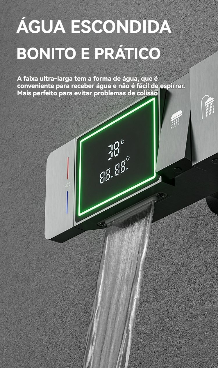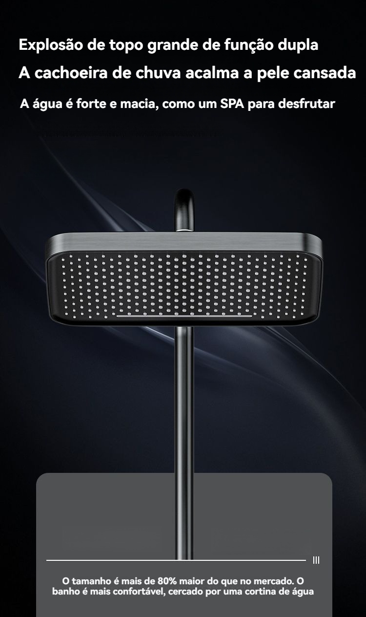 O minimalismo alia-se à alta tecnologia com um sistema de iluminação LED, um chuveiro amplificador de ar, um fluxo de água grande e suave, um corpo de chuveiro delicado em cobre e um controlo preciso da temperatura para qualquer idade.