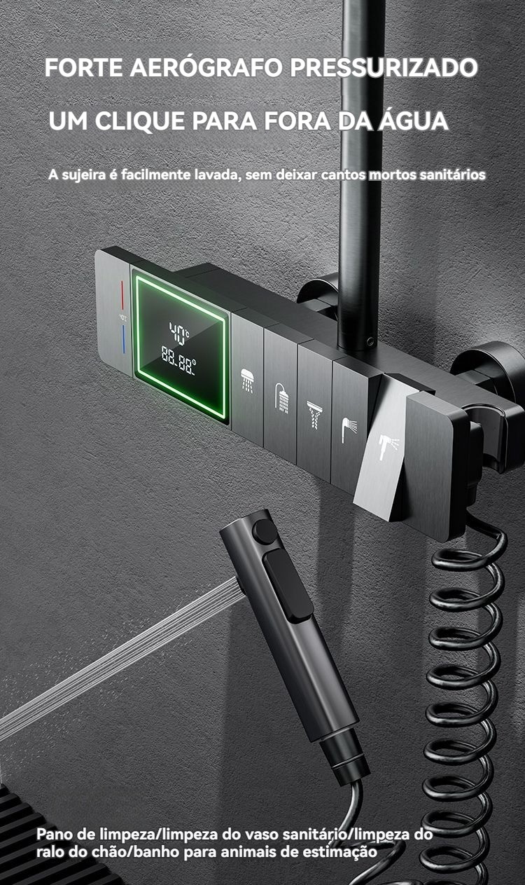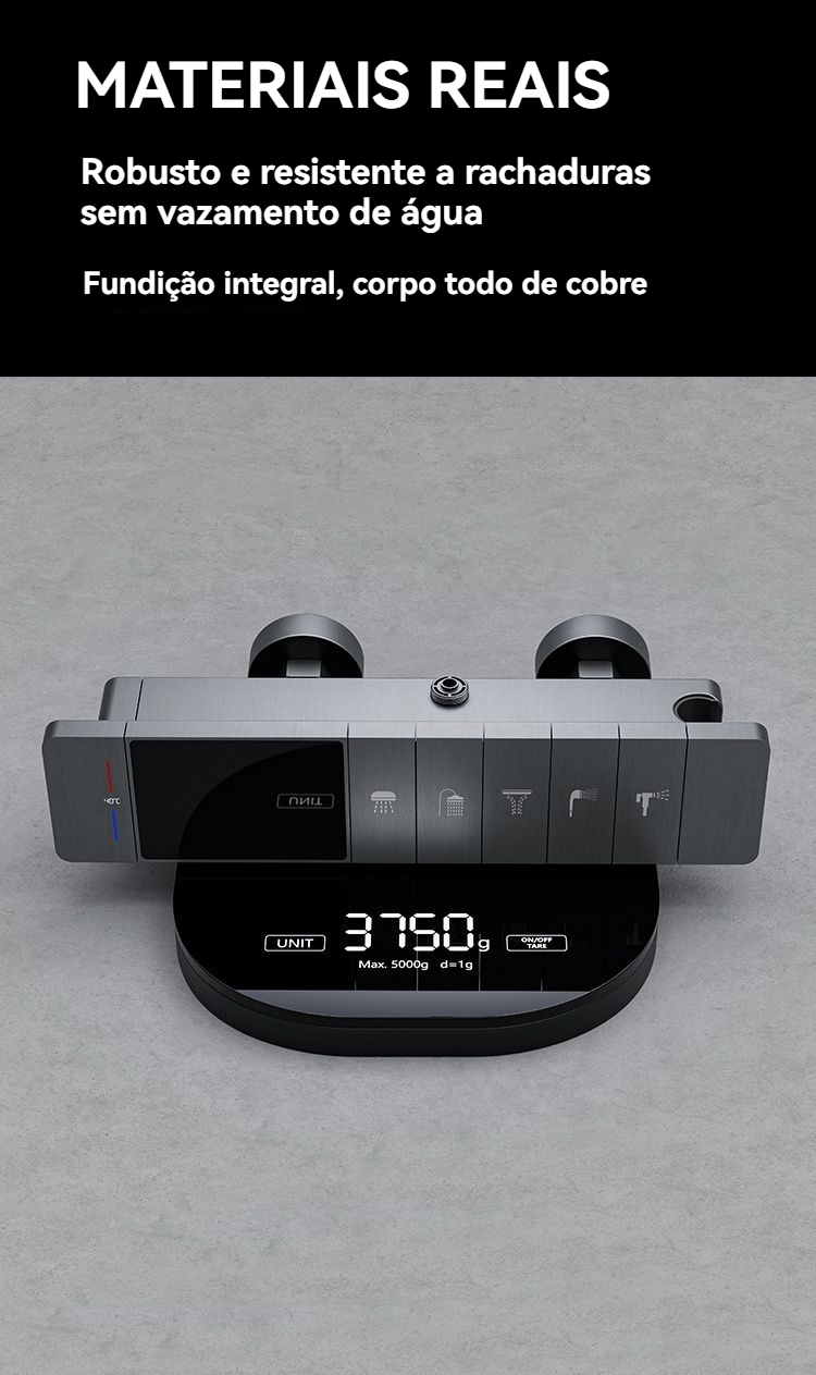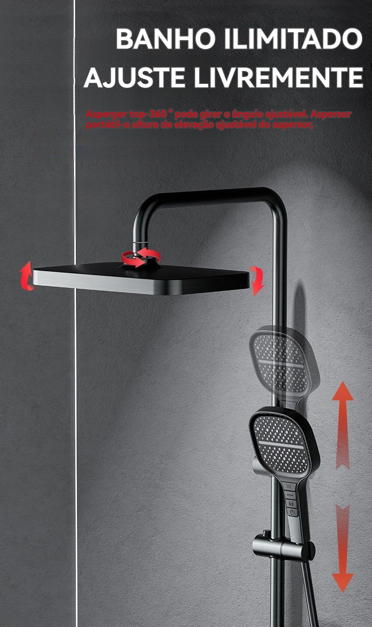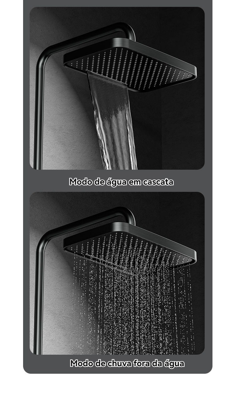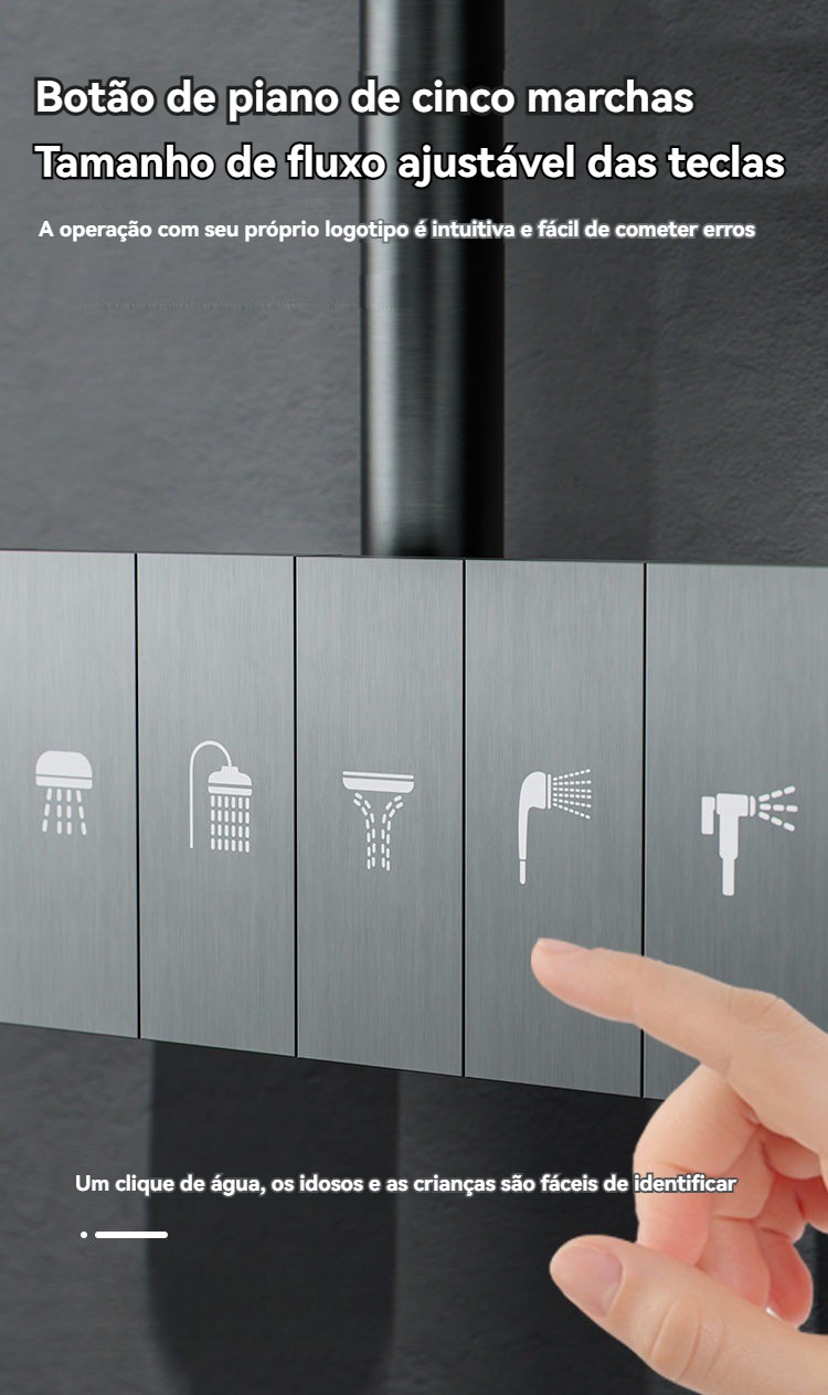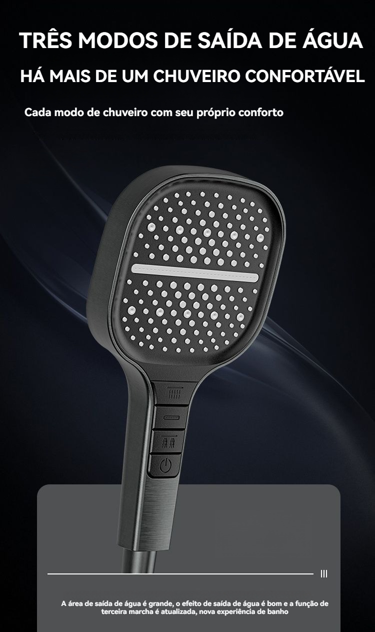 O minimalismo alia-se à alta tecnologia com um sistema de iluminação LED, um chuveiro amplificador de ar, um fluxo de água grande e suave, um corpo de chuveiro delicado em cobre e um controlo preciso da temperatura para qualquer idade.