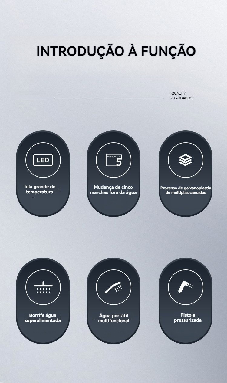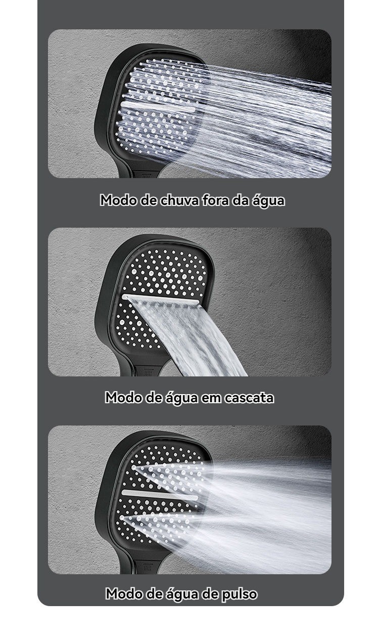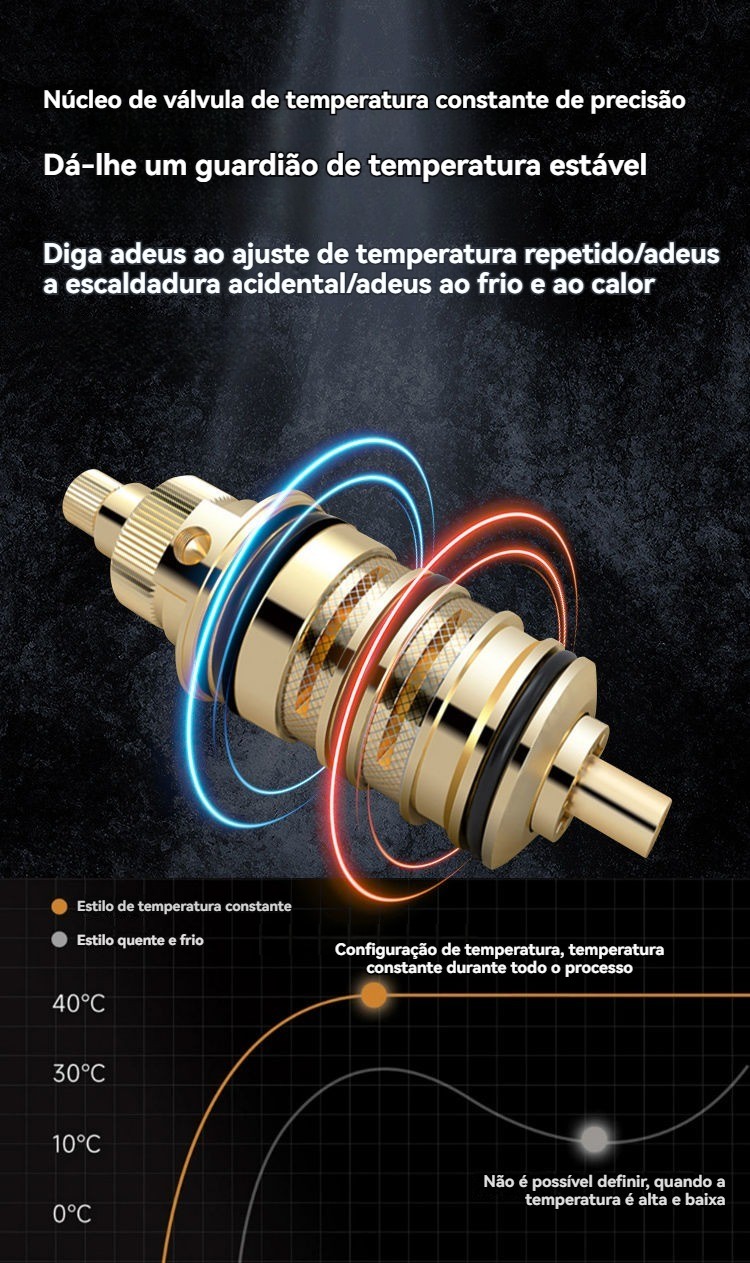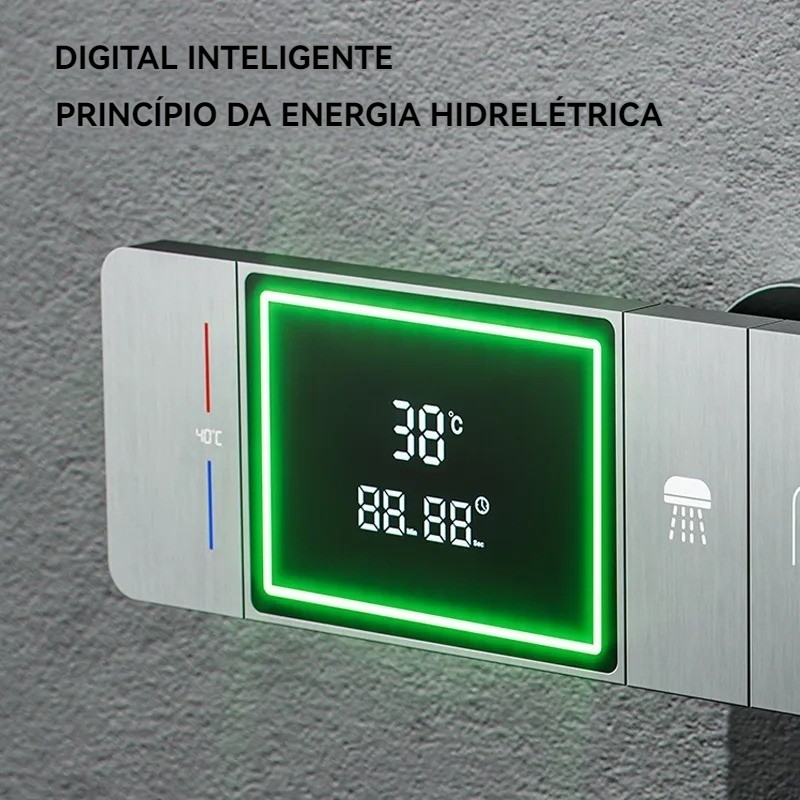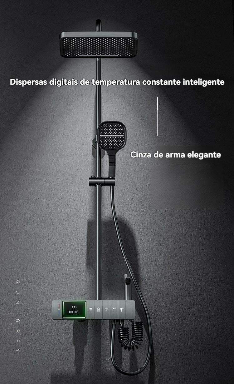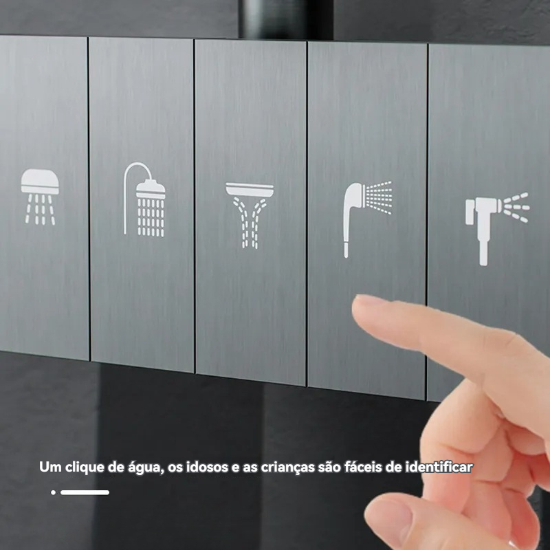 O minimalismo alia-se à alta tecnologia com um sistema de iluminação LED, um chuveiro amplificador de ar, um fluxo de água grande e suave, um corpo de chuveiro delicado em cobre e um controlo preciso da temperatura para qualquer idade.